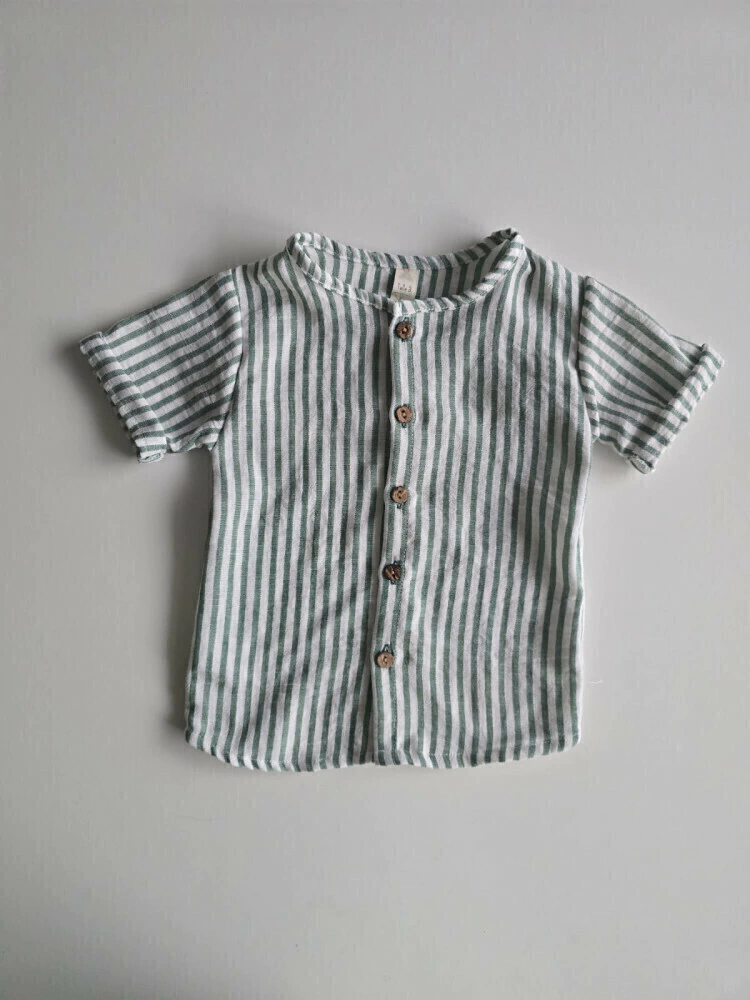 Nuestra camisa de lino rayada es la prenda ideal para que tu bebé esté cómodo y con mucho estilo. Confeccionada en lino liviano, es fresca, suave y perfecta para los días cálidos. Sus colores verde musgo y beige la hacen súper combinable, para que tu peque siempre luzca impecable.
