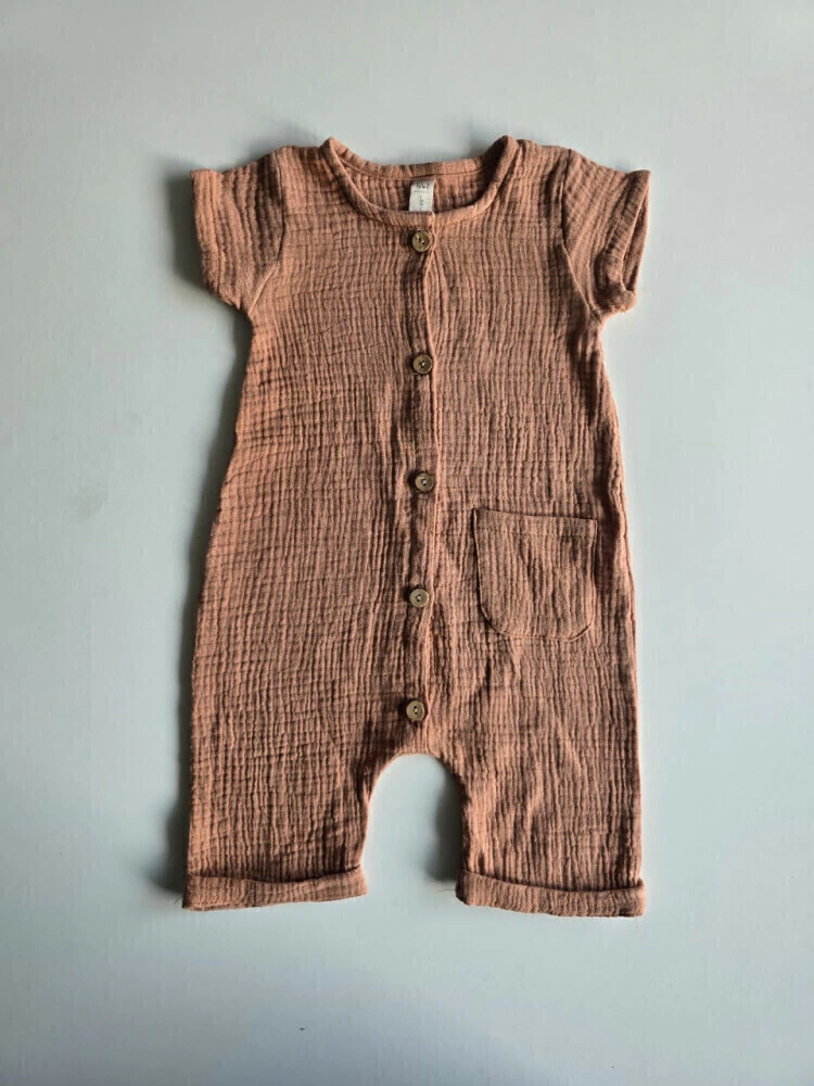 Este mono de manga corta en tela baby cotton es perfecto para climas cálidos: liviano, respirable y suavecito, pensado para que tu bebé se sienta cómodo en cada movimiento. Su diseño práctico lo convierte en la prenda ideal para acompañar las tardes de juego o los paseos en familia.